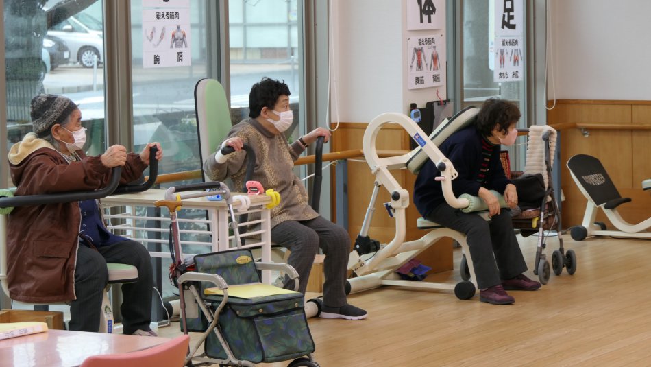 動作に必要な部位を強化する運動(太ももの運動、お尻の運動、腹筋の運動、歩くための運動等)をフロアの壁に張り出し自主運動やスタッフと一緒に行う運動として行います。必要な利用者様には、自宅でできるホームプログラムとして配布も行います。 -